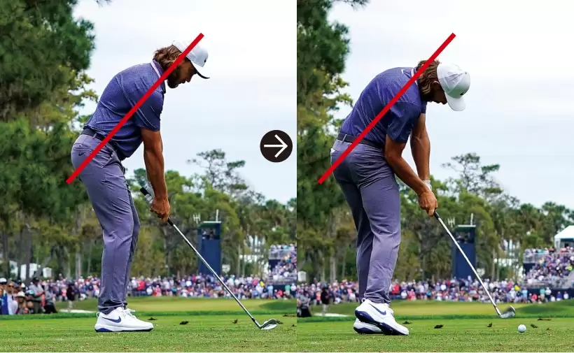 アドレスの前傾角度が保たれるからクラブが理想的な軌道に乗り、ダウンブローにとらえられる。