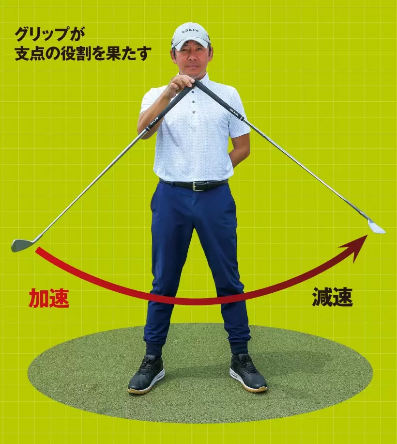 グリップエンドを固定し、クラブヘッドを振り子のように動かそう。下降するときはヘッドが加速し、上昇するときは減速することがわかる。