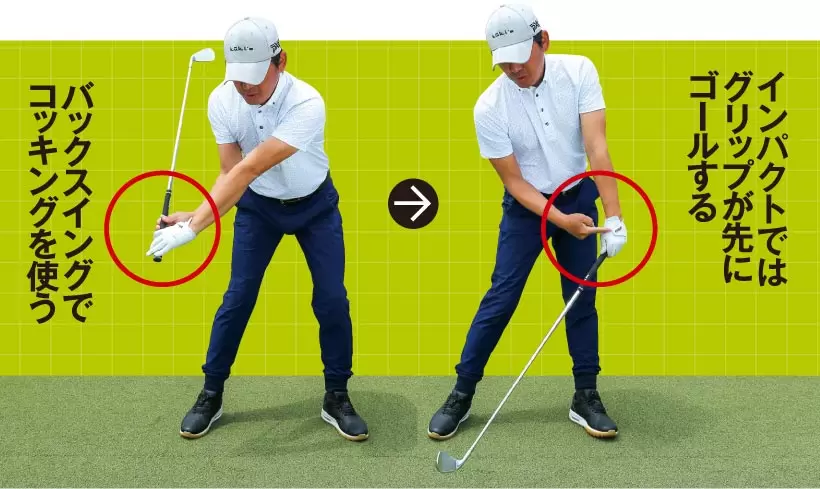 クラブヘッドが加速中にボールをとらえるためにグリップ支点を目標側に動かす。
