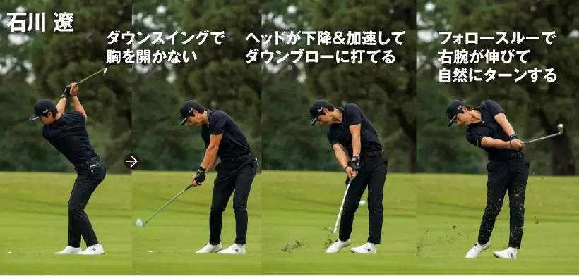 フェースターンもダウンブローの絶対条件。結果的に長いインパクトゾーンがつくられてショットの正確性がアップする。