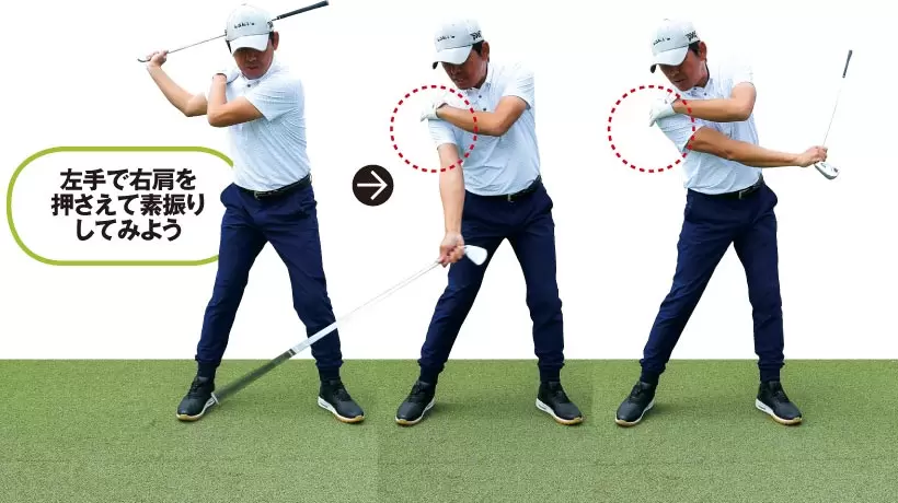クラブのヘッド側を右手で持ち、左手で右肩を押さえたままで素振りを繰り返そう。ダウンスイングで胸の開きを抑えることでダウンブローに打つイメージが明確になる。