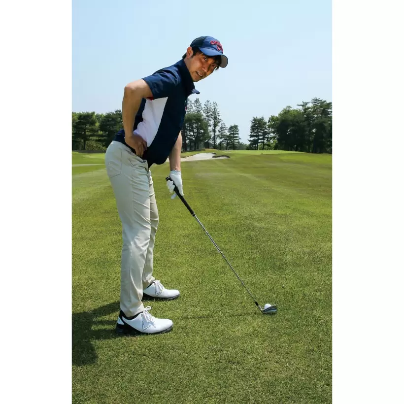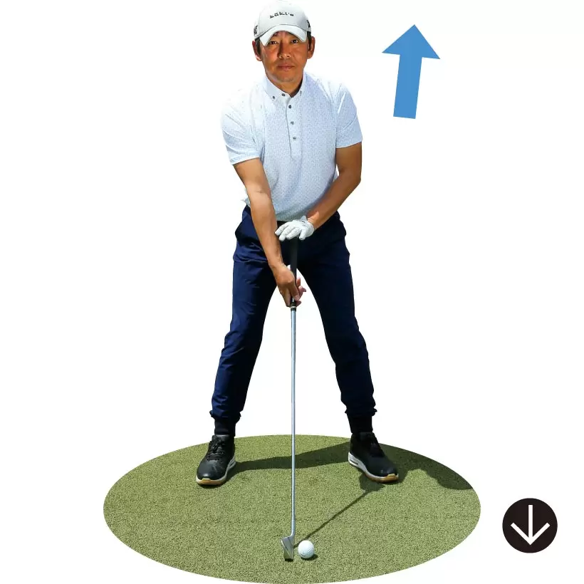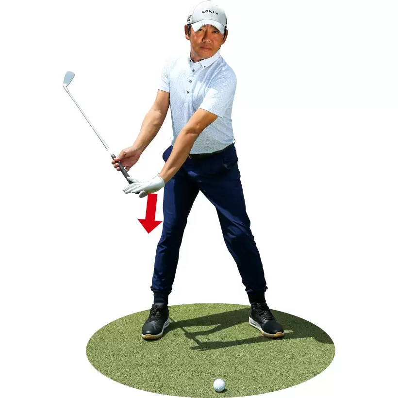 骨盤前傾の構えをつくればクラブをダウンブローに振り下ろせる。