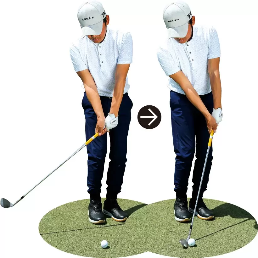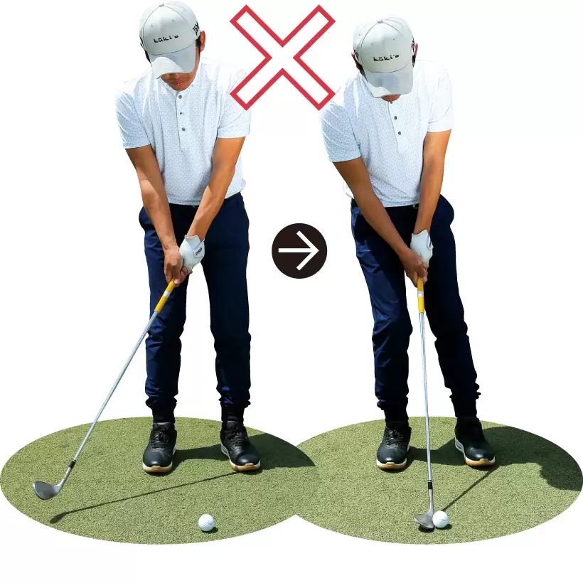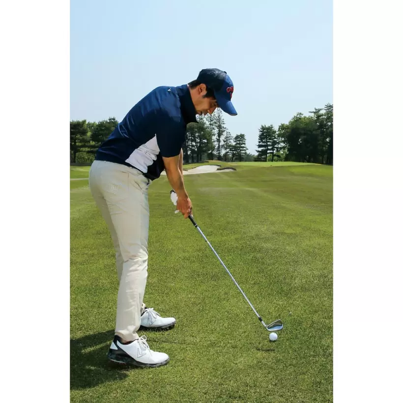 骨盤が立ったアドレスではクラブを横に近い角度で振りやすく、ダウンブローに打てない。