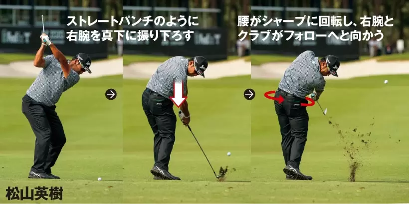 右腕を思い切り真下に下ろすと、左腰が自然に切れる。腕主体の動きで下半身が勝手に動いてくれるのだ。