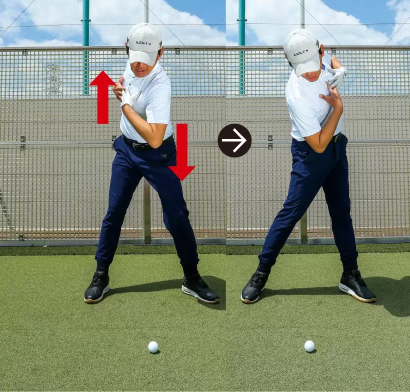 バックスイングでは右ワキ腹が伸びて左ワキが縮み、ダウンスイングは右ワキ腹が縮んで左ワキが伸びるのが正しい回転のイメージだ。