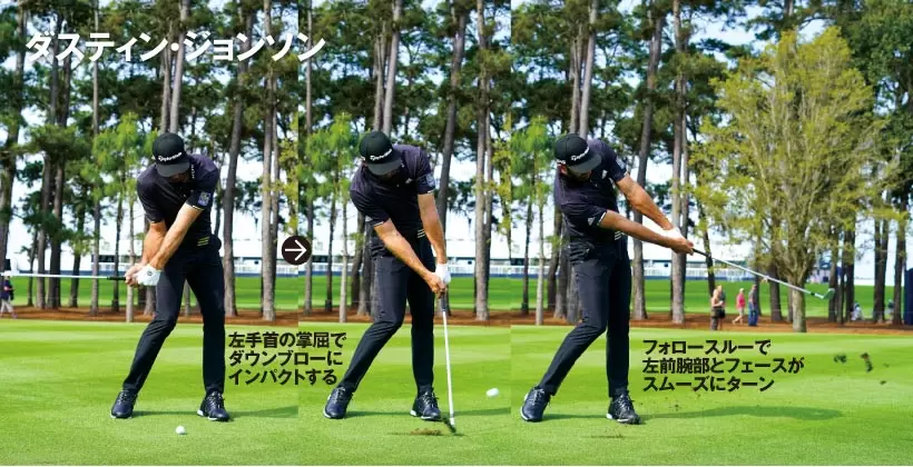 インパクトまで左手がスムーズに下降すると左手首が手のヒラ側に折れる。これがダウンブローにとらえるコツ。