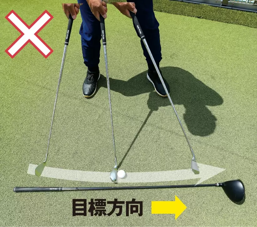 クラブを自然に下げると少し傾くことがわかる。グリップエンドとヘッドの中心を結ぶラインが垂直となるためだ。