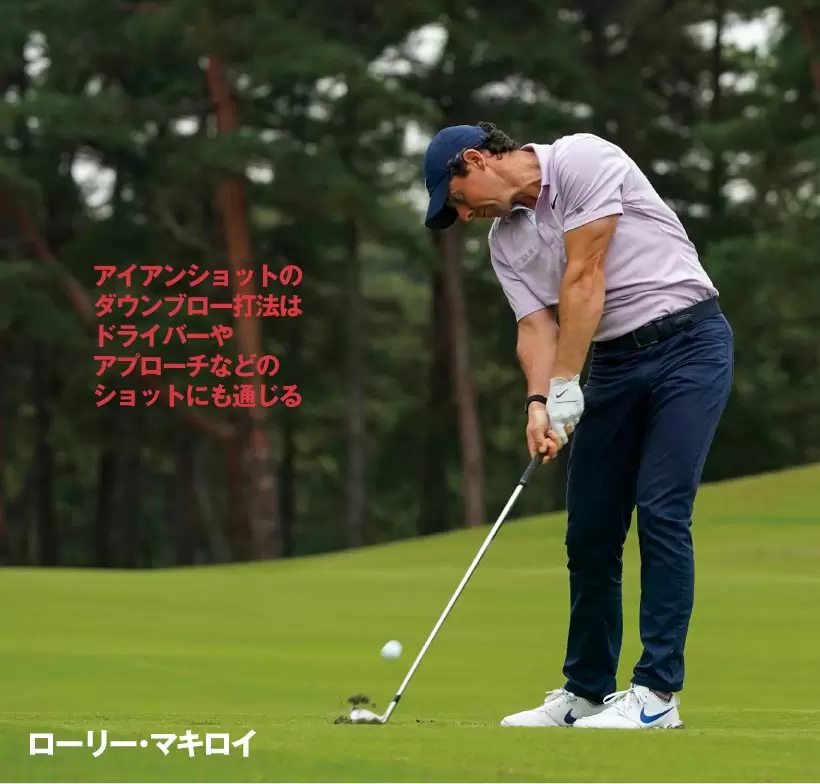 ショットの安定性は世界でもピカイチのR・マキロイ。理想的な角度からクラブを振り下ろし、球を正確にダウンブローにとらえている。