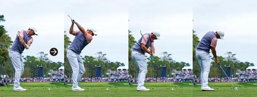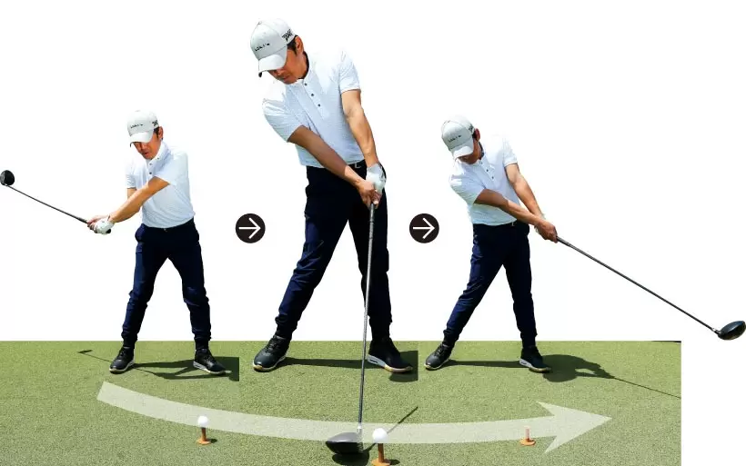 クラブヘッドの重心移動によって緩やかな円軌道を描く。クラブフェースが返って見えるが、軌道に対してフェースは長くスクエアに保たれる。