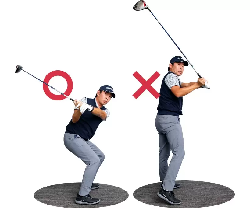スライスに悩んでいる人は、この沈み込む動きができていない可能性が高い。沈み込みがないと、ダウンスイングでは右肩が前に出て、上半身だけが被ってしまうスイングになるのでアウトサイド・イン軌道になりやすい。その結果、スライスが出やすくなる。