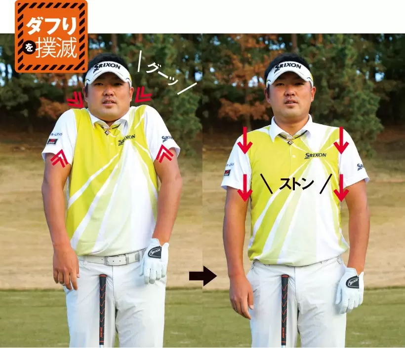 力んだままスイングするとスムーズに動けず右肩が下がる。
