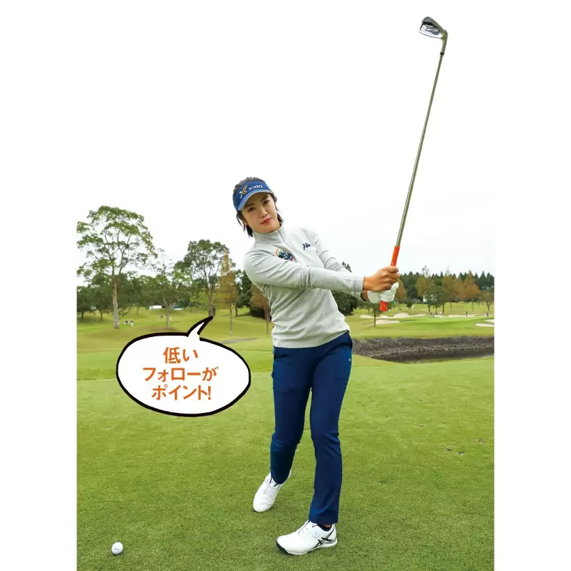 ボールの手前から、なるべくヘッドを低く保つ。インパクトは緩めない。