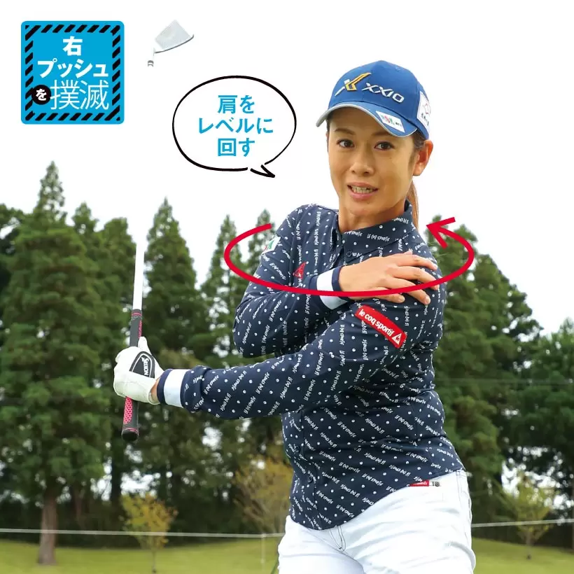 インパクトで左肩が上がるとフェースが右を向いてプッシュする。