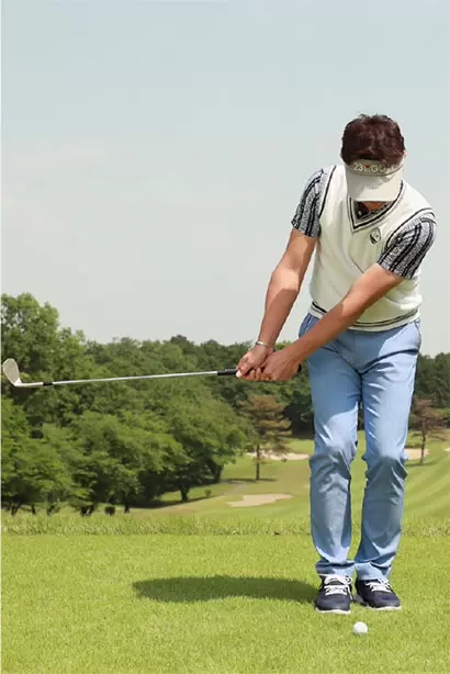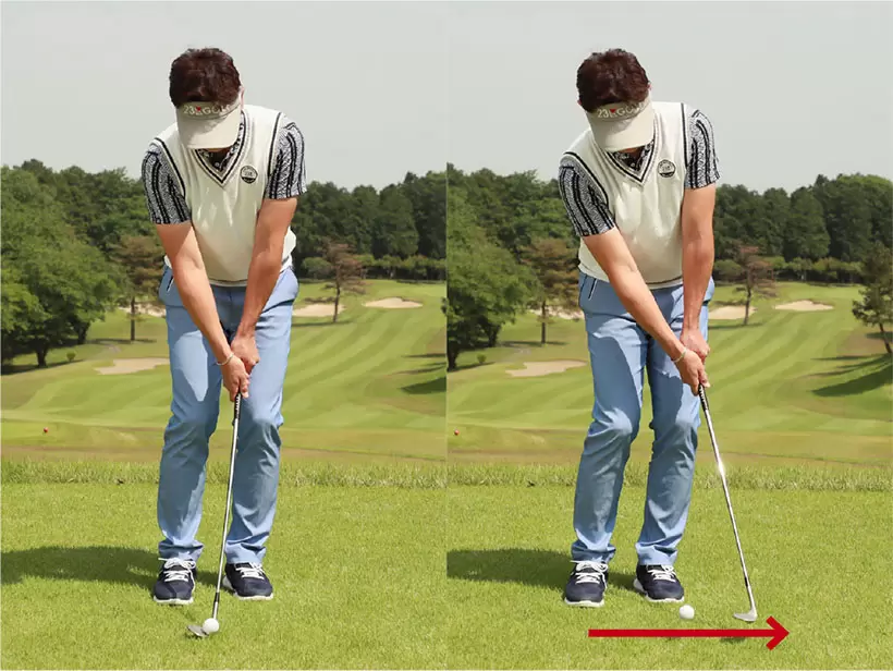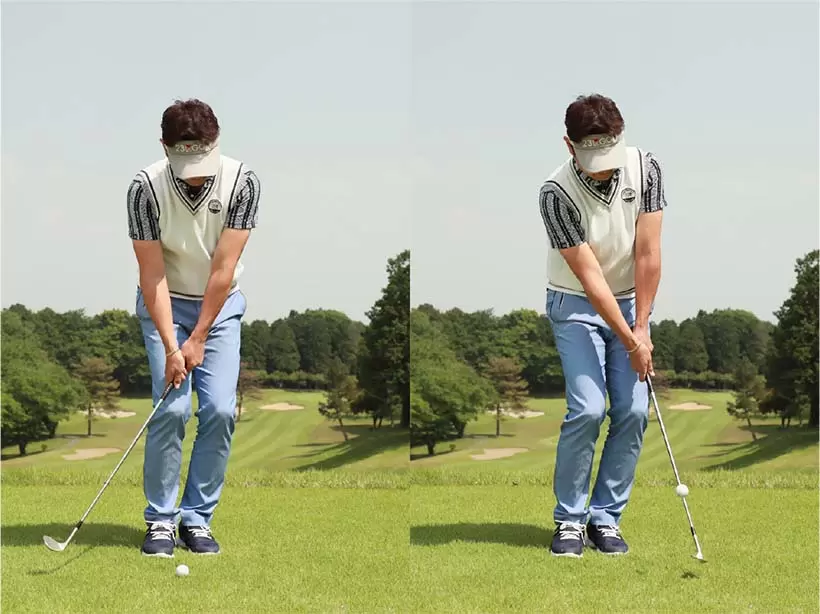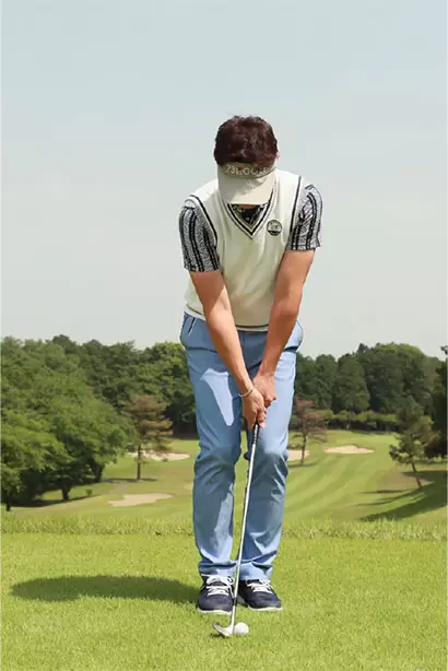 スタンスを狭めにし、ボールの位置はスタンスの中央。軽くハンドファーストに構える。