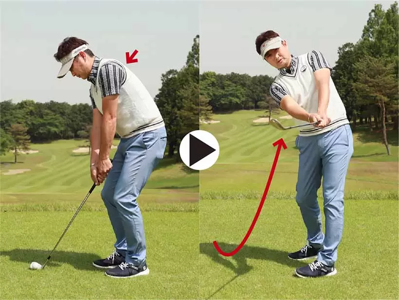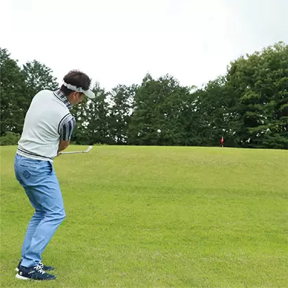 直立姿勢で素振りを繰り返しながら、上体を少しずつ前傾しよう。アプローチの正しいスイングが理解できる。