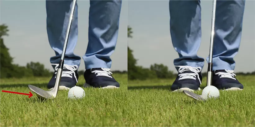 鈍角に振り下ろしてバウンスを滑らせれば、少しくらい手前をダフっても安心。