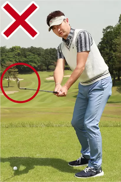 テークバックは腕とクラブを体の真正面にキープし、胸を右に回すだけのイメージ。
