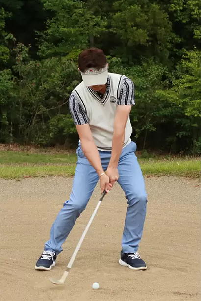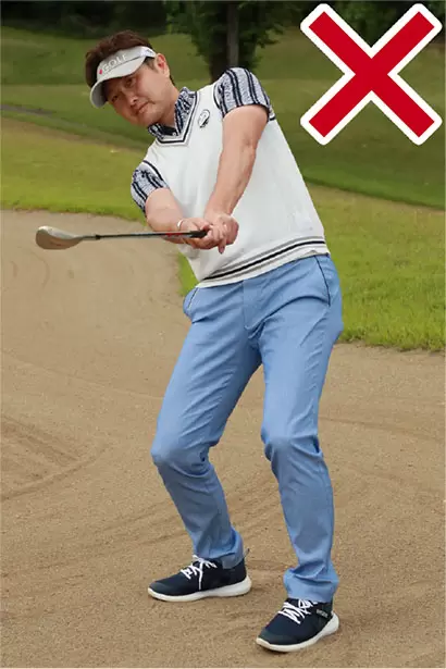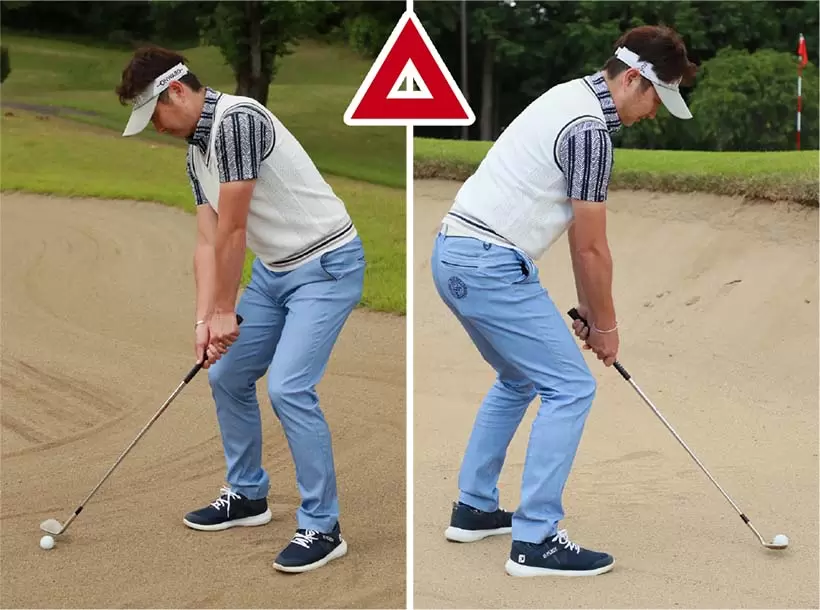 両手を左モモの前にセットしたハンドファーストの構えはNG。フェースの刃から砂に潜って振り抜けなくなるのでバンカーショットには適さない。