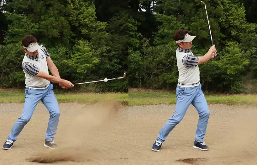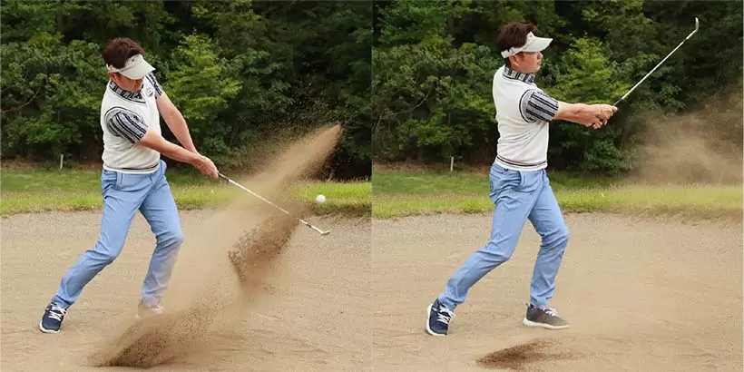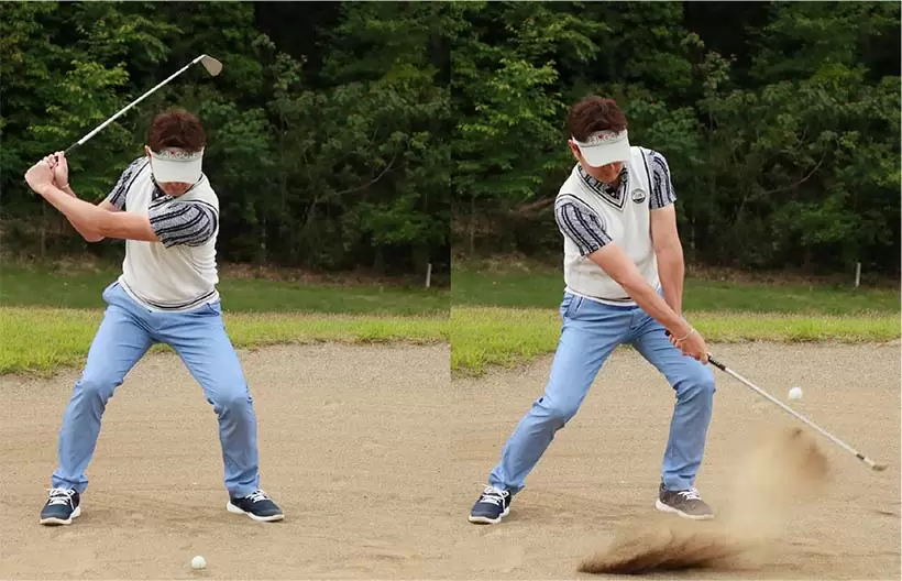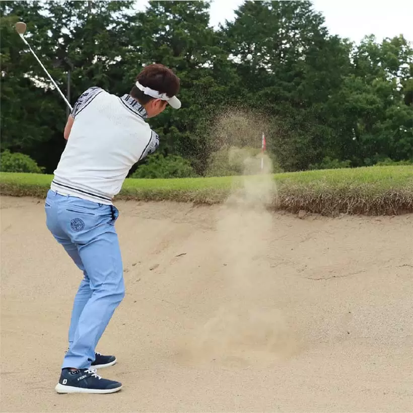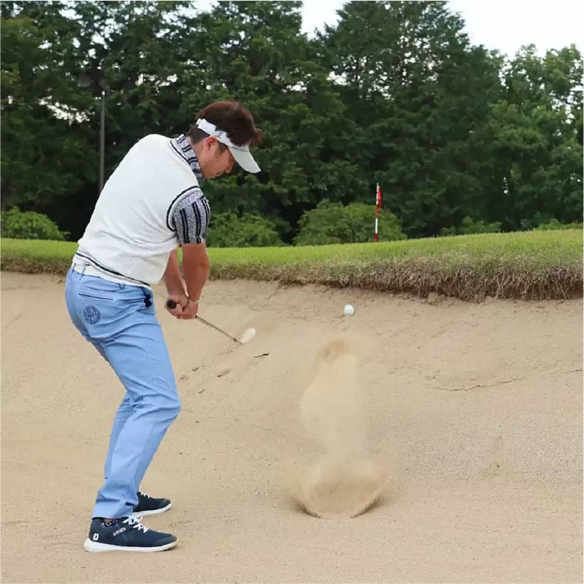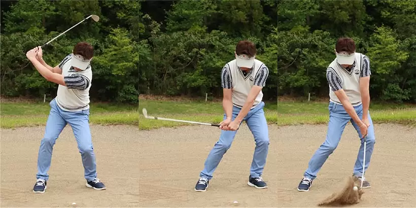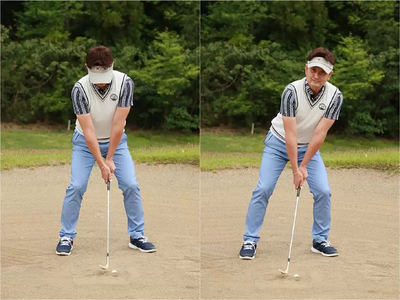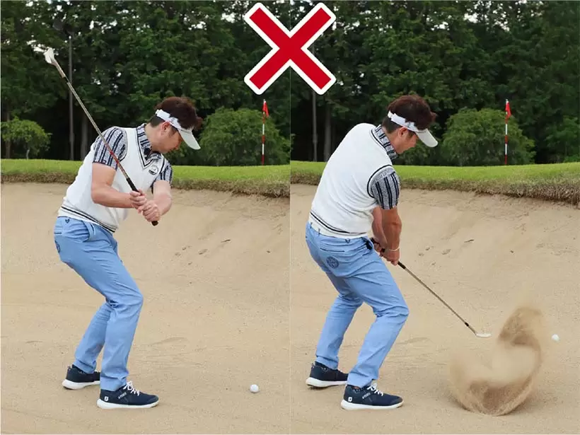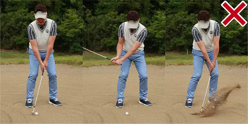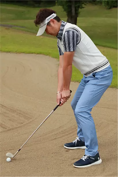 ボールを右足の前に置いて上から打ち込もうとしてもインパクトが詰まってしまい、バンカー脱出が難しい。