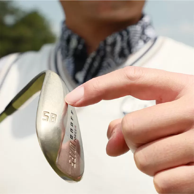 ソールの出っ張りを「バウンス」という。バウンス角が大きいほどフェースを開かなくてもやさしく打てるが、10度前後のバウンス角が無難だ。