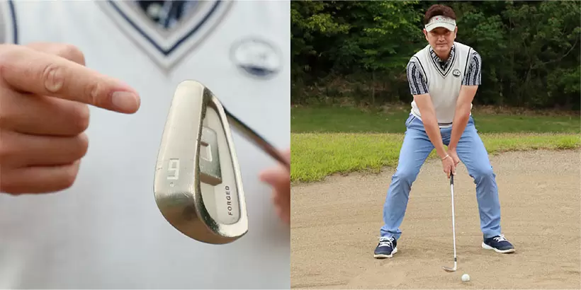 目玉のバンカーの場合、フェースをかぶせて打つのがセオリー(左)だが、フェースを開いてバウンスを使って打つ方法もある(右)。