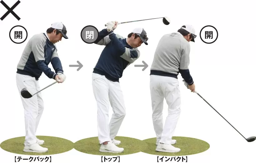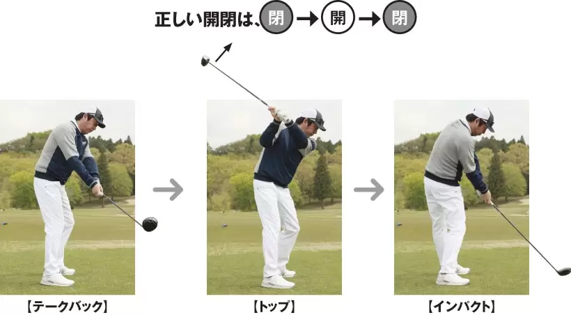 スライサーの多くが、テークバックでフェースが開き、その反動でトップではフェースが閉じている。そのため、切り返し以降ではフェースが開いてしまう。