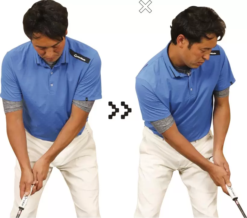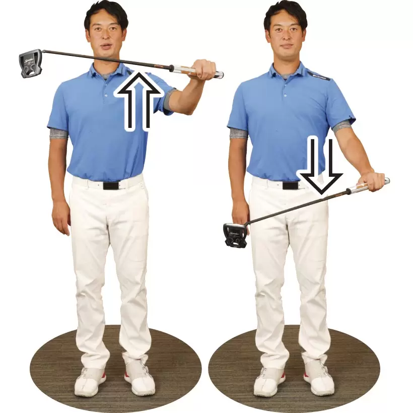 ワキ(腕のつけ根)が空かないようにパターを上下させると、左肩甲骨とまわりの筋肉がストローク時と同様に動く。