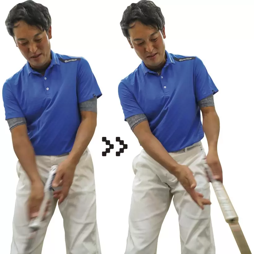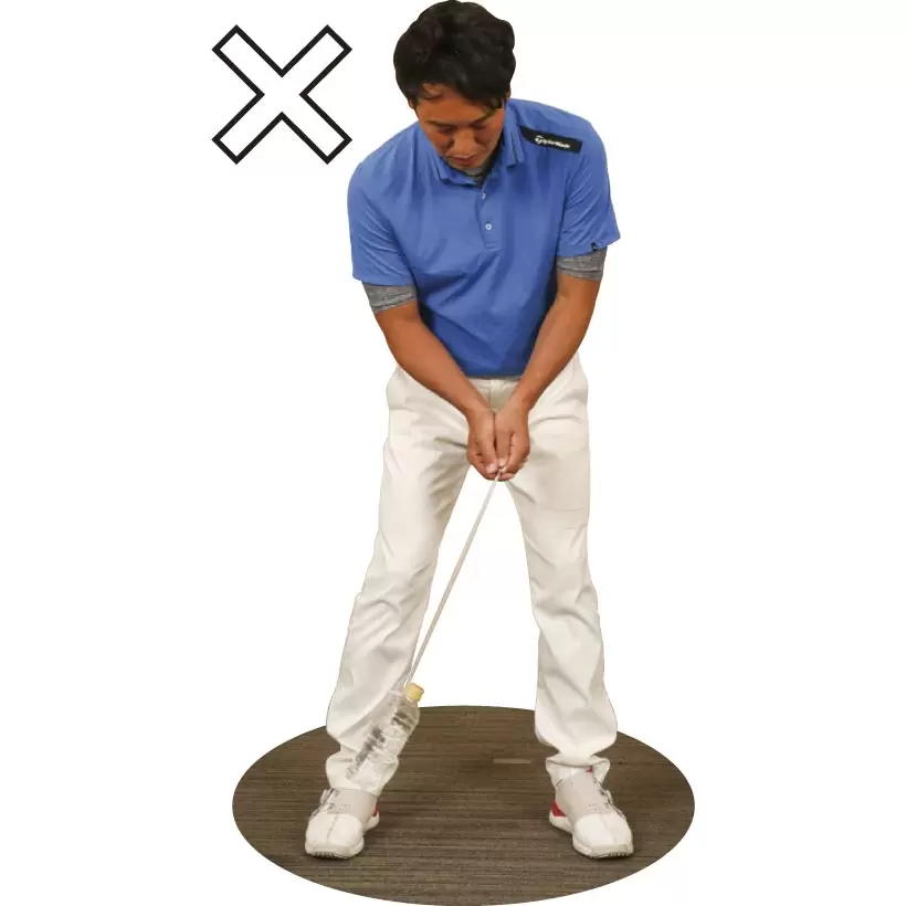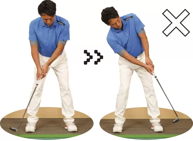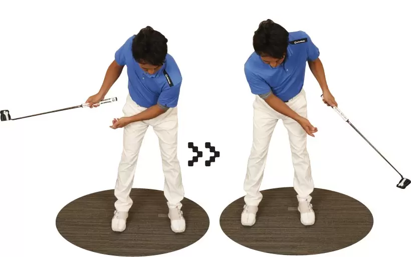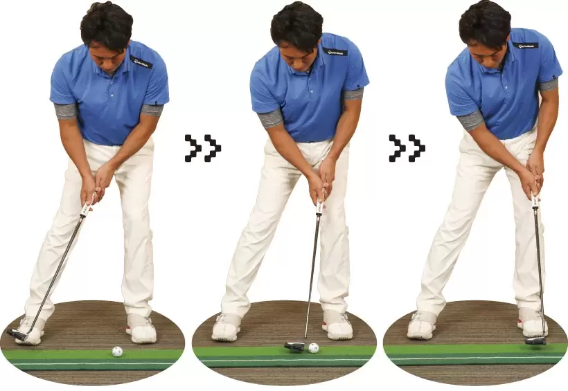 左手でパターを持って上腕を体側につけ、フェースが真上を向くようにして体の前に差し出す。