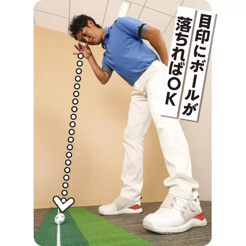 適当な目印の真上に目をセット。目の位置からボールを落としてそこに落下すればOK。これを両目でやる。