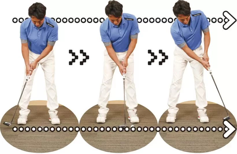 右ワキ(腕のつけ根)が空かないようにパターを上下に動かす。右肩甲骨と周囲の筋肉がストロークのように動く。