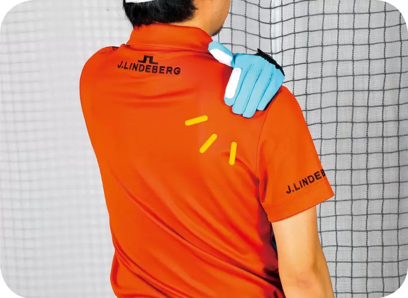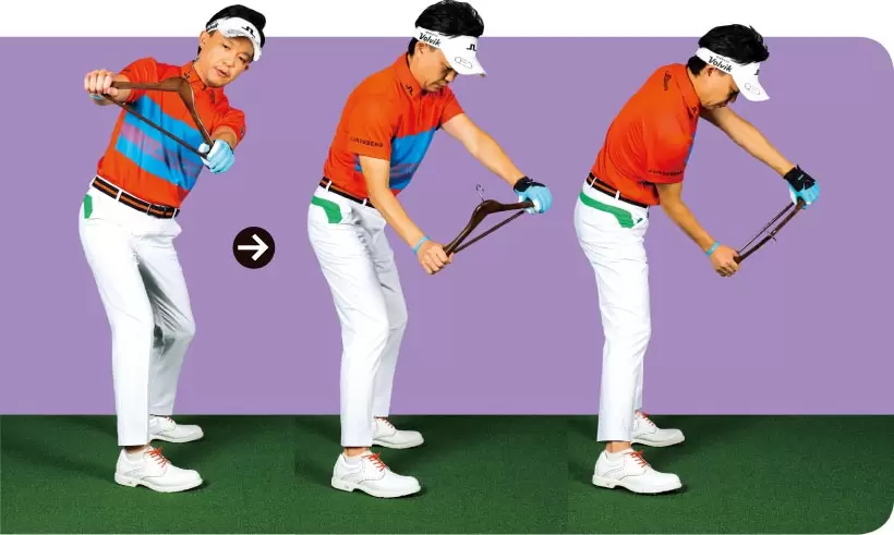 左肩と右腰にクラブをあててタスキがけに。この状態でバックスイングすると上半身と下半身が一緒に動く。