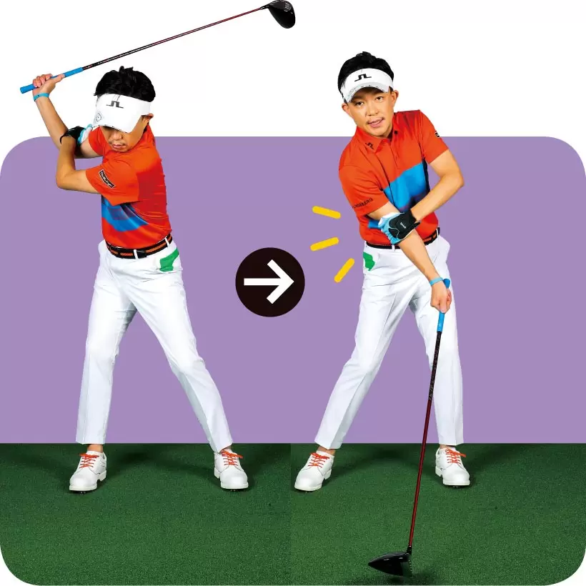 トップの位置まで体を回したら、左手で右肩を引きながらインパクトへ。