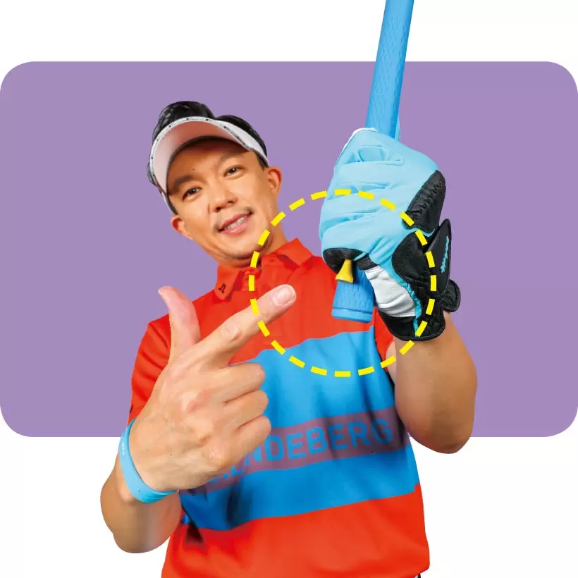 左手のバックライン側にティを握って打つのも右手の抑制に効果あり。小指、薬指、中指の3本でしっかり握って打つ。