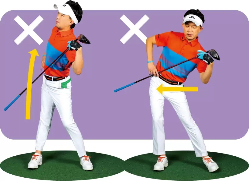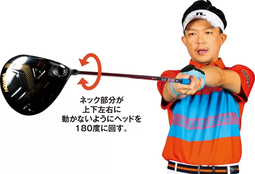 真っすぐに立ち、クラブと腕が真っすぐになるよう肩の高さに上げる。