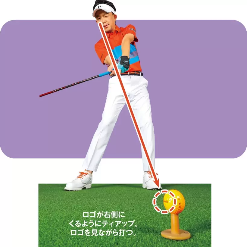 トップで左目をつむり、ウインクしたままインパクトへ。ロゴが右側にくるようにティアップ。ロゴを見ながら打つ。