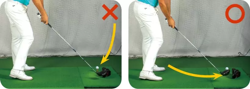 ヘッドがインサイドから下りれば当たらずスライスもしないが、 アウトから入るとスライス軌道になって当たる。