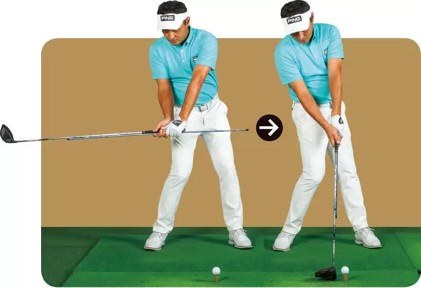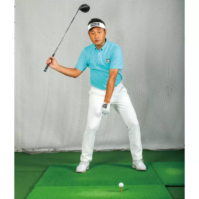 右手の人さし指がシャフトに触れるくらいクラブを短く持ち、ヘッドがボールに届かない状態でアドレスする。