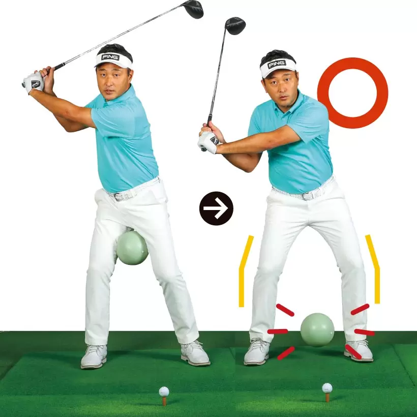 太モモの間に挟んだボールを落としながら振れると右腰が下がらない。