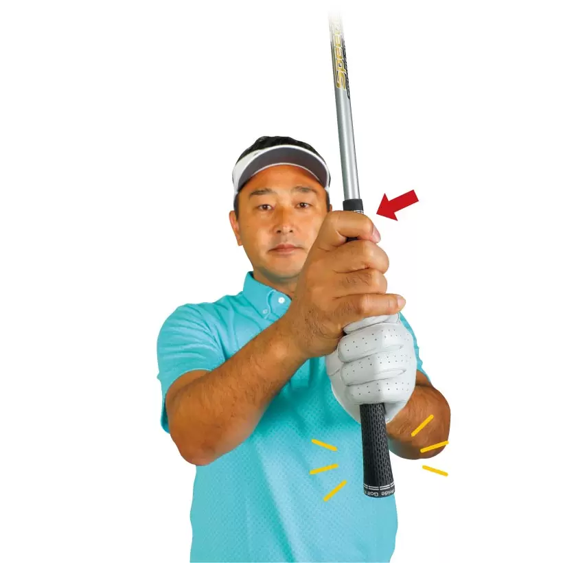 アーリーリリースしているとダウンスイングで棒が左ワキ腹に当たる。