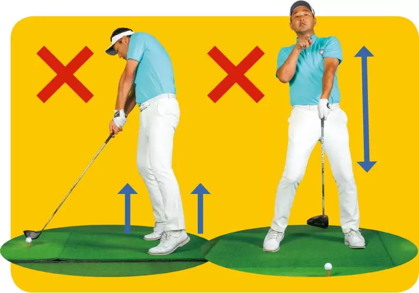 体が伸び上がるとすくい打ちになってリーディングエッジに当たる。また、インパクトでジャンプしながら打つと胸が前を向いてチョロに。