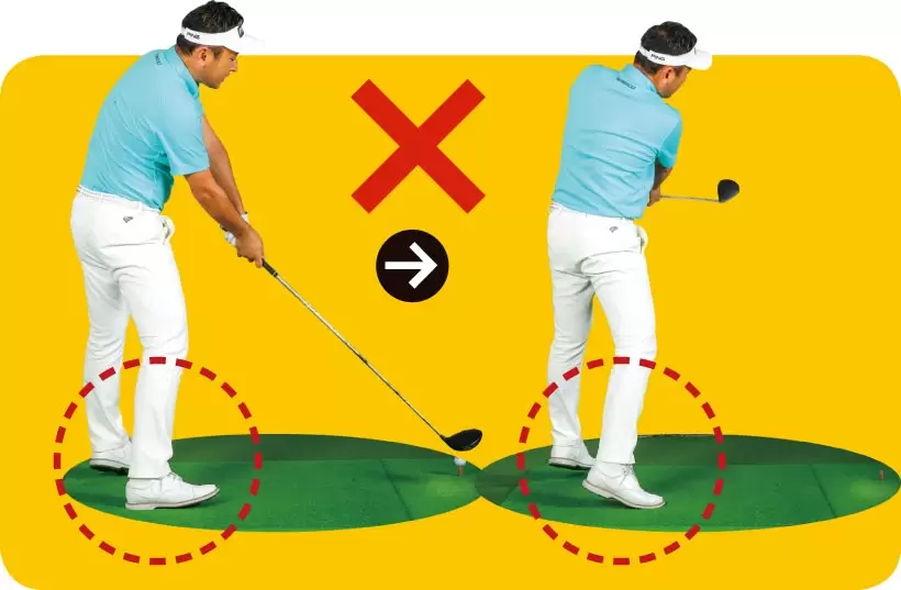 ダウンスイングで右ヒザが内側に曲がると右腰が下がってヘッドが手前に落ちる。