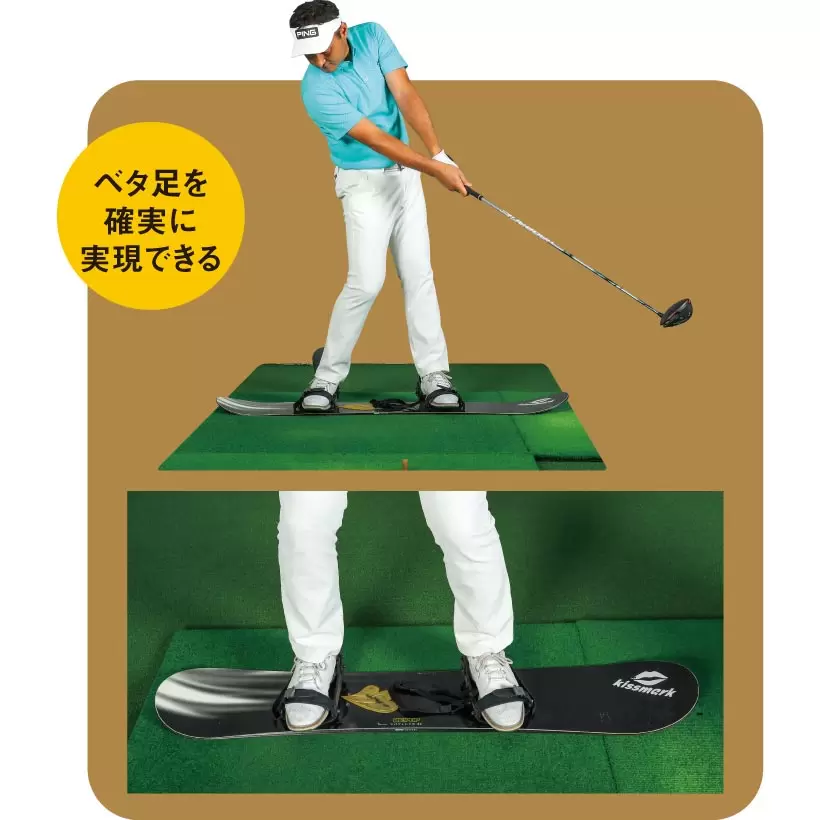 もしあれば、スノーボードに乗って素振りをするのも効果的。足を固定し滑らないように気をつけてやろう。