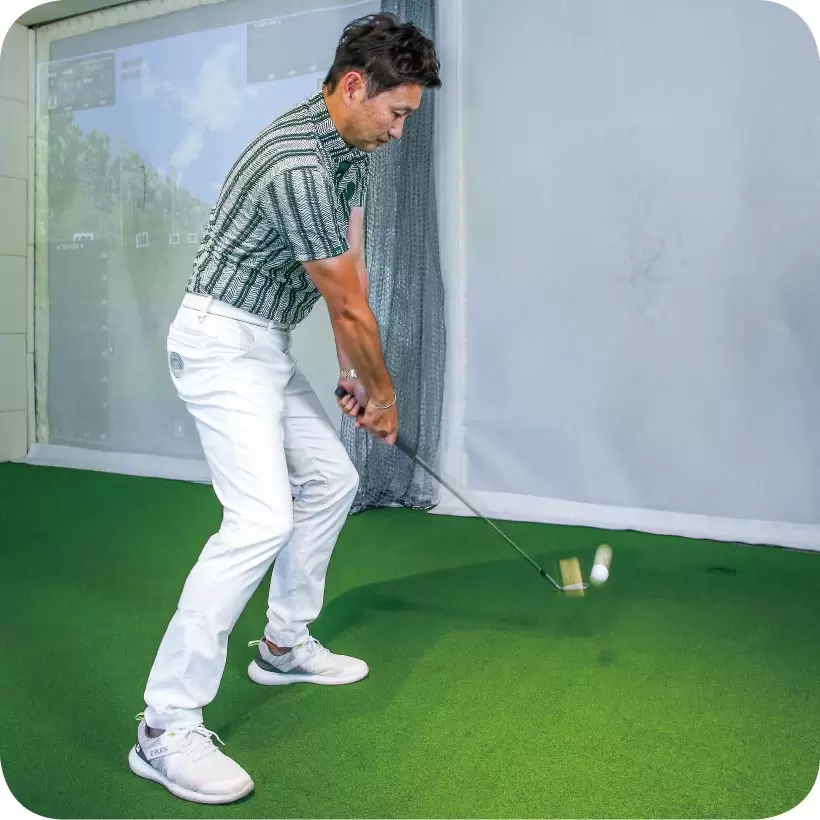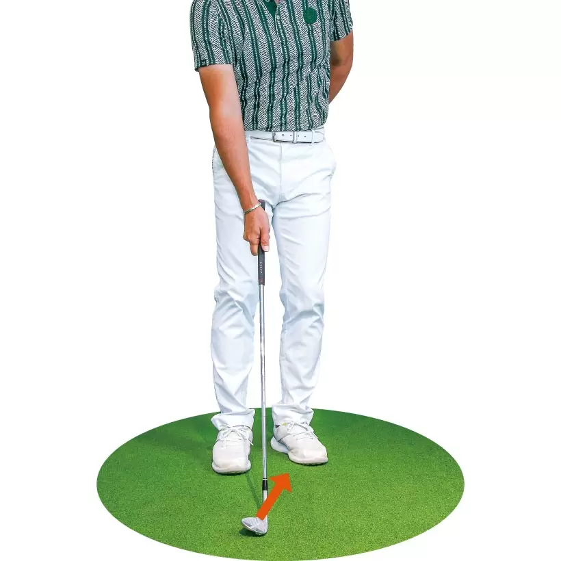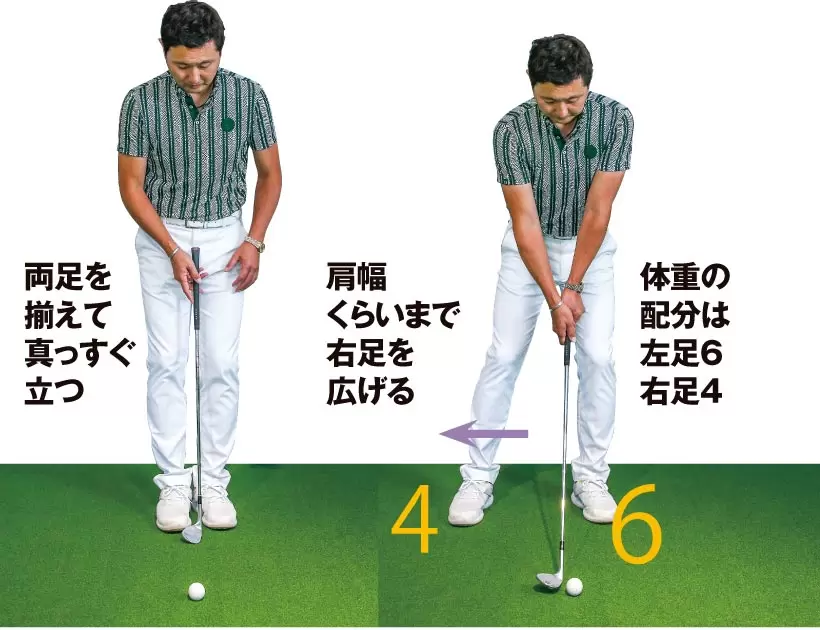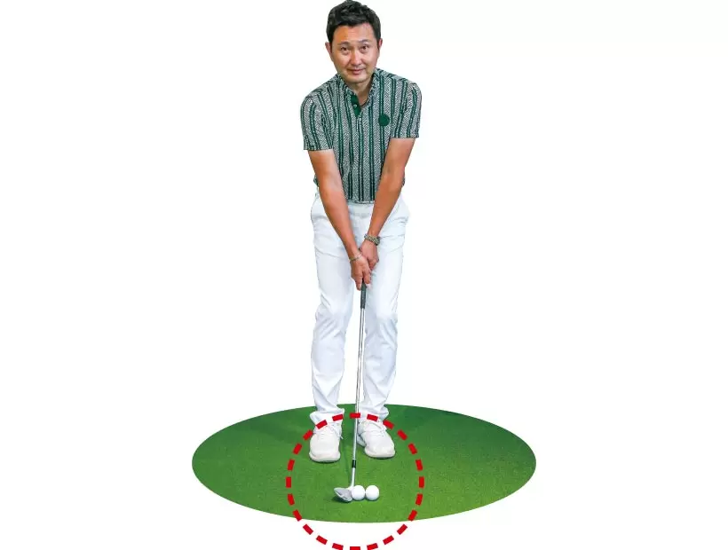使うクラブはSW。両足を揃えてボールを体の中心の前にセットした姿勢から右足を広げる。そうするとボールの位置は左足カカト内側の前となる。