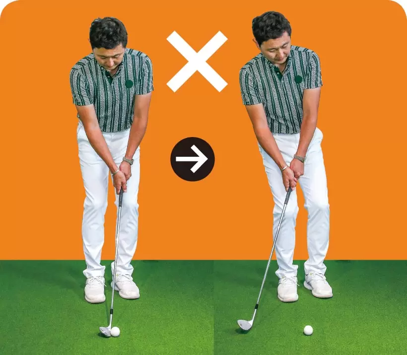 左ツマ先を開いて軽くオープンスタンスに構えてもいいが、右足体重の構えはNG。すくい打ちのミスを招きやすいからだ。