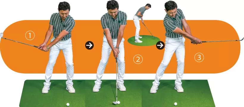 ①上げるアプローチは転がすアプローチよりもキャリーを大きく出すため、振り幅が大きくなる。ただしスイング中に手首を折ったり、腕を捩り回したりしないこと。②アドレスの前傾角度をキープしてインパクトを迎える。③腕とクラブを体の正面にキープしたまま胸を回すのがコツ