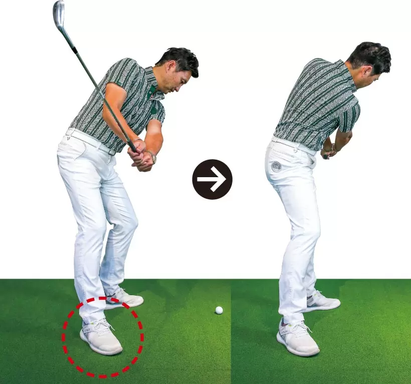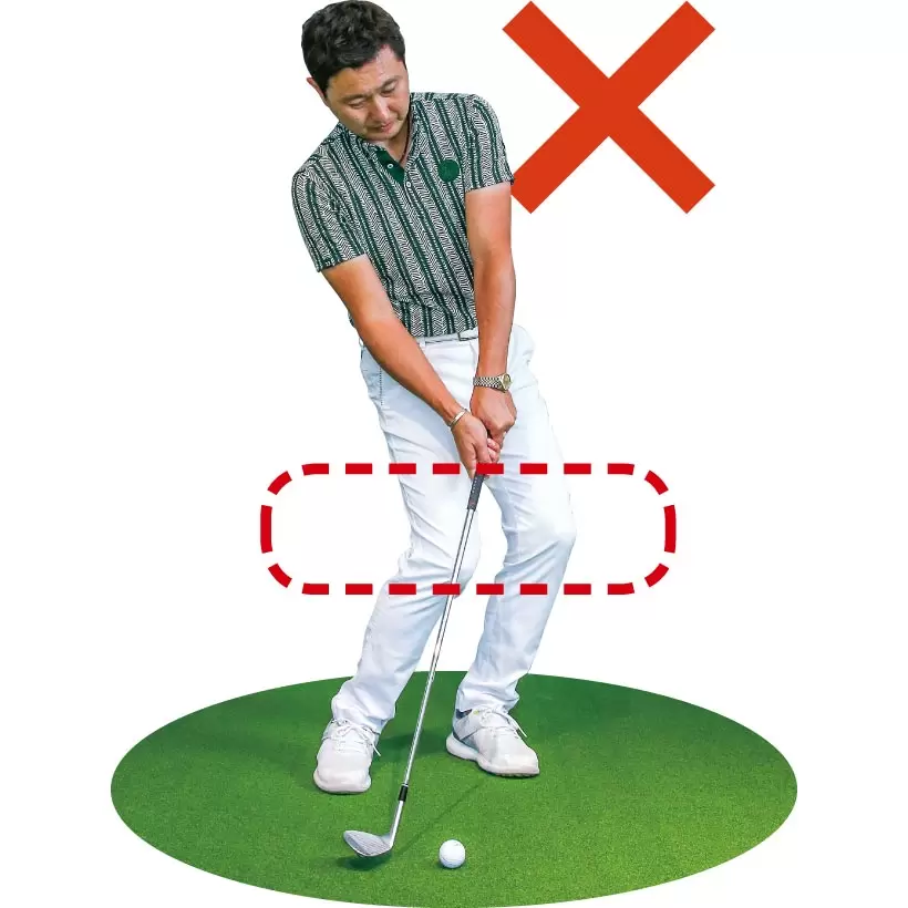 ダウンスイングで右ヒザが前に出るとシャンクが生じやすい。
