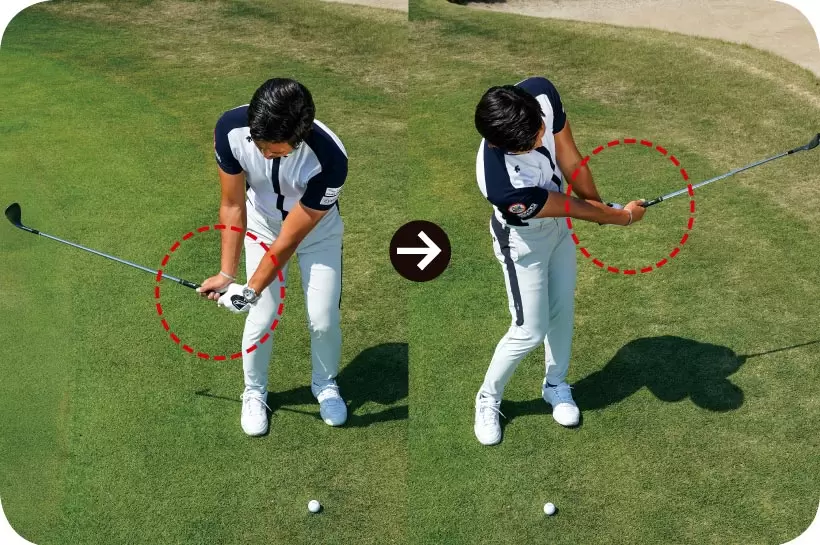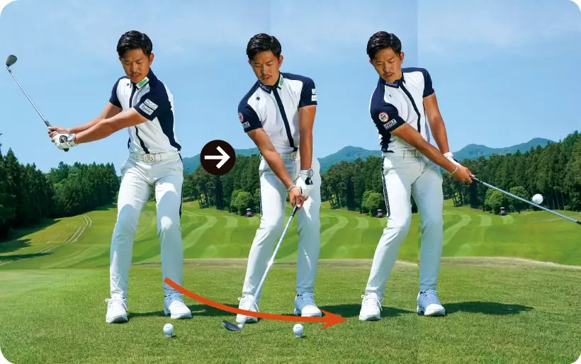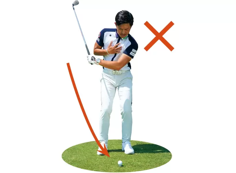 気持ちの上では思い切りの良さが必要だが、両腕とクラブを胸の前にキープしたままでスイングすることが大切だ。