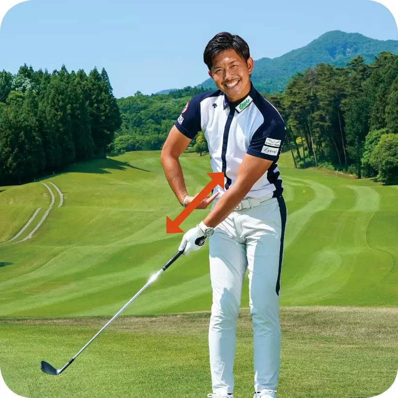 スイング中はお腹とグリップエンドが連動するイメージを持とう。