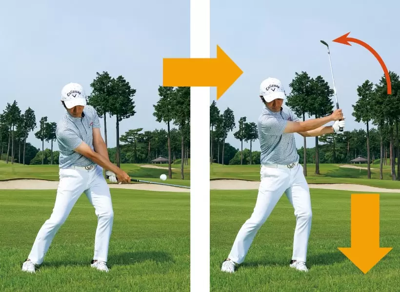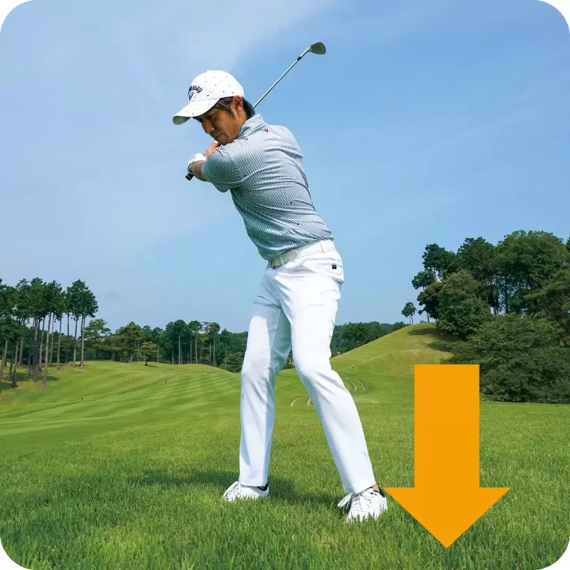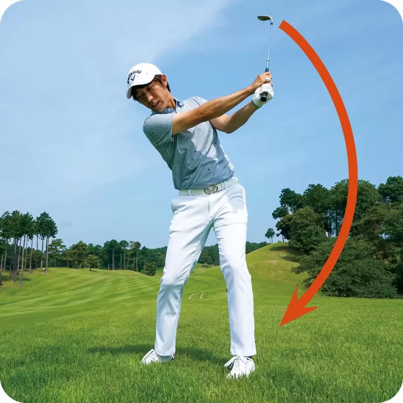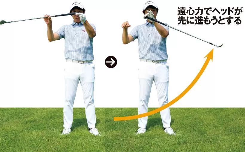 グリップエンドを指でつまんでクラブを振り子のように動かしてみると、ヘッドが下降するスピードで遠心力が働くことがわかる。この遠心力を利用するのが大切なポイントだ。