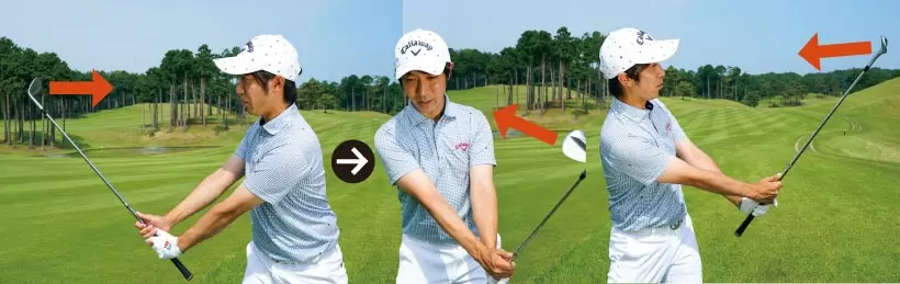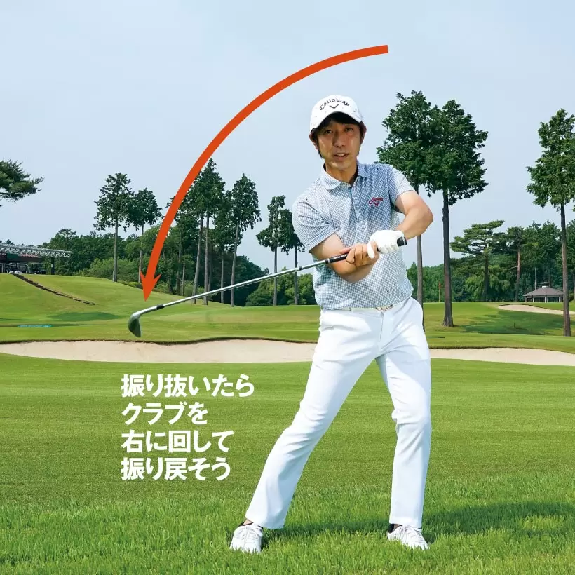 遠心力を利用してフォロースルーがとれていれば、クラブをすぐに右側に振り戻せる。